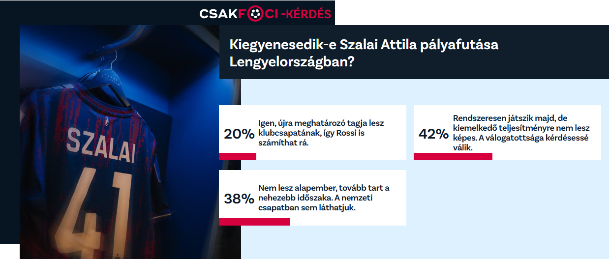 Azonban sokan látják borúsan Szalai jövőjét. A második legtöbb szavazatot (38%) az az opció kapta, hogy tovább fog tartani a lejtmenet, és Szalai Lengyelországban sem lesz alapember. Így - szerintük - a jelenleg nehézségekkel küzdő bekket a nemzeti csapatban sem fogjuk látni.