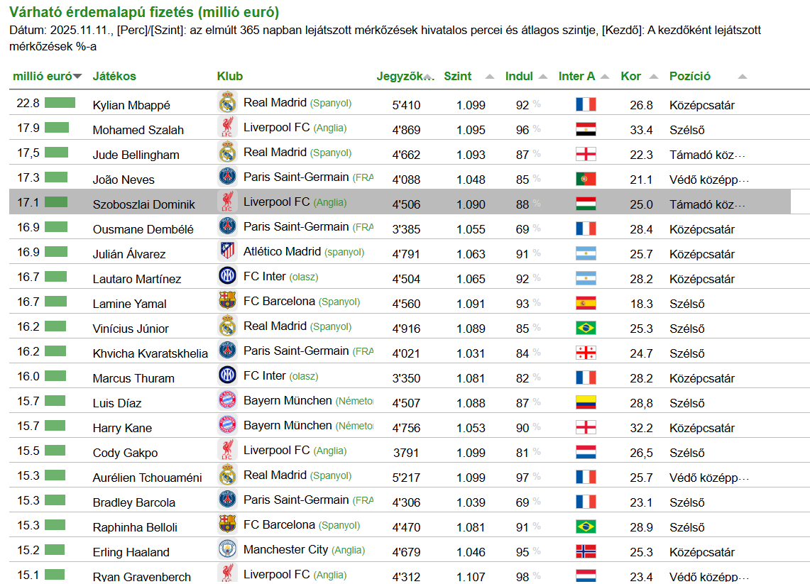 A lista élén Kylian Mbappé (Real Madrid) áll, aki a számítások szerint évi 22,8 millió eurós bruttó fizetést érdemelne sportteljesítménye alapján. A második helyen Mohamed Salah (Liverpool), a harmadikon pedig Jude Bellingham (Real Madrid) végzett.