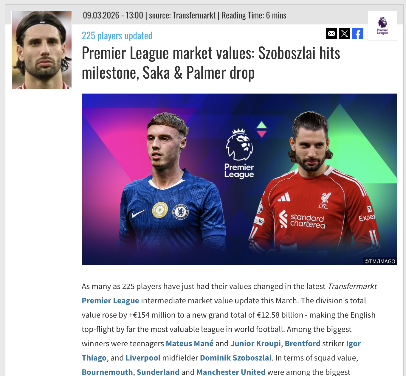 Szoboszlait így a Liverpoolban már csak egy csapattársa előzi meg, Florian Wirtz (110 millió euró), míg Alexander Isak éppen 100 millión áll (az övé 120 millióról csökkent ennyire). Kerkez Milos neve mellett továbbra is 40 millió euró szerepel.
