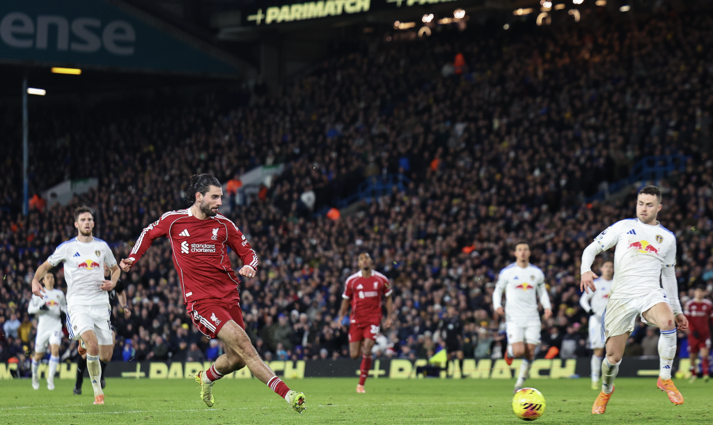 A Kerkez Milossal és Szoboszlai Dominikkal felálló Liverpool a Leeds otthonába látogatott a Premier League-ben. Kerkez kis híján hamar bajba került, amikor a 6. percben egy fejese után a saját kezére pattant a labda, de a VAR szerint sem ért 11-est az eset. Szoboszlai két nagyobb helyzetet teremtett az első félidőben: szabadrúgása után Van Dijk fölé fejelt, jó kiugratását követően Gakpo tüzelt, egy blokkról mellé pattant a labda. A legközelebb Jones lövése után járt a gólhoz a Pool, de a felső léc megmentette a Leedset.