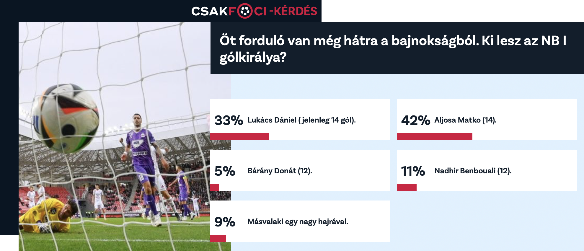 Az ötödik helyezett még mindig Varga Barnabás 10 találattal, aki azonban már az AEK Athén játékosa, a 9 gólosoknak (Elton Acolatse, Gruber Zsombor, Hahn János, Molnár Ádin, Skribek Alen) pedig már csak egy óriási hajrával lenne esélyük a gólkirályságra. A fentiek apropóján legutóbbi szavazásunkon arra voltunk kíváncsiak: olvasóink szerint ki végez majd az élen a versenyben?