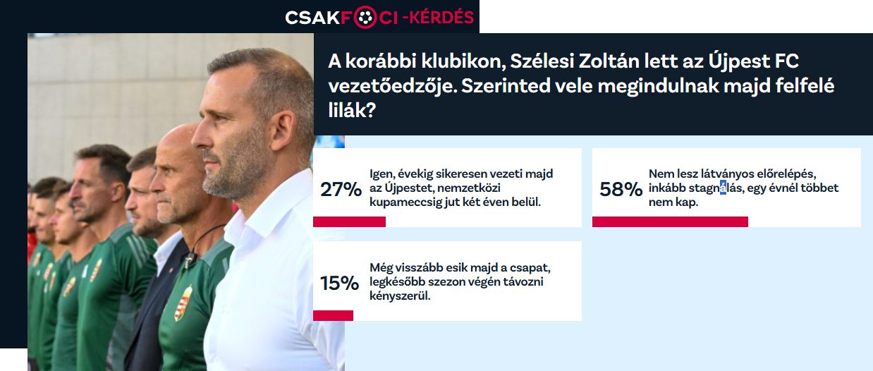 A válaszadók 58 százaléka úgy véli, hogy Szélesi irányításával nem várható látványos előrelépés: szerintük a csapat inkább stagnálni fog, és az új vezetőedző várhatóan egy évnél hosszabb időt sem kap a kispadon. Ezzel szemben 27 százalék kifejezetten bizakodó: szerintük Szélesi Zoltán hosszú távon sikeresen vezetheti az Újpestet, és akár két éven belül nemzetközi kupaszereplésig is eljuthat a csapat. Akadt 15 százalék, aki ennél borúlátóbb forgatókönyvet vázolt fel. Ők úgy gondolják, hogy az Újpest teljesítménye tovább romolhat, és Szélesi legkésőbb a szezon végén távozni kényszerülhet.