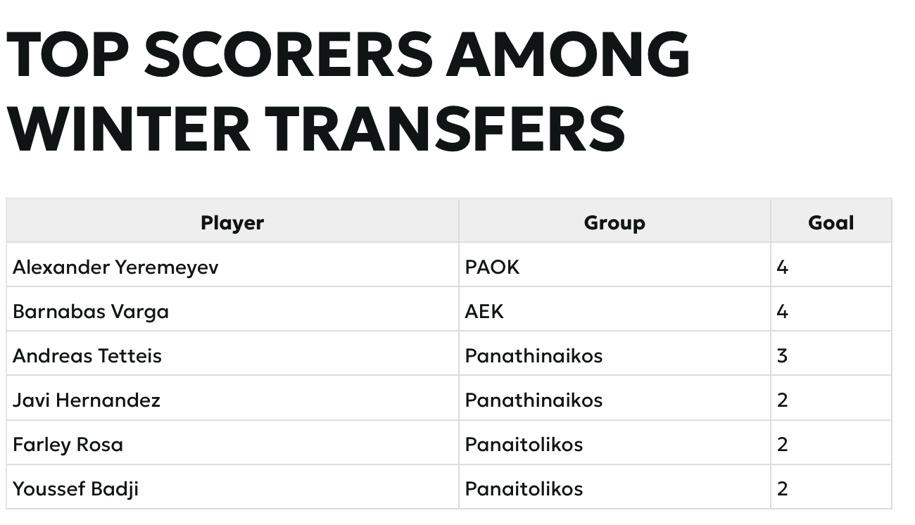 A görög Nova Sports azt vizsgálta meg, hogy mely csapatok tudták a téli átigazolási szezonban a legtöbb gólt hozni csapatukhoz eddig. Az együttesek között a Panathinaikosz vezet, amelynek három közelmúltbeli szerzeménye hét találattal segítette az együttest tavasszal, őt követi az AEK Athén és a PAOK.