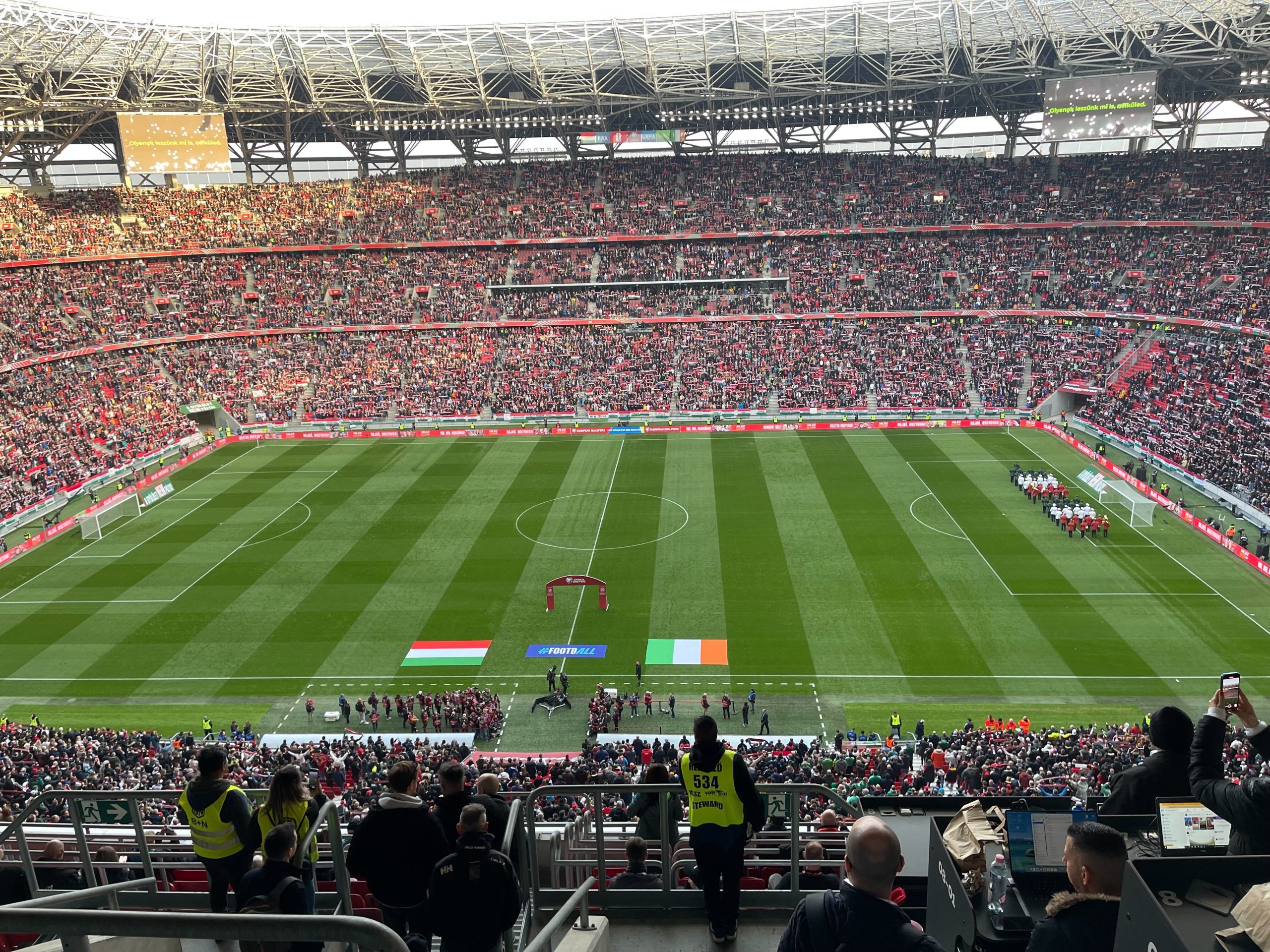 SZÜNET. Lukács korai góljára büntetőből válaszoltak az írek, majd Varga Barnabás elképesztő bombájával ragadtuk újra magunkhoz a vezetést, 2–1 a félidőben.