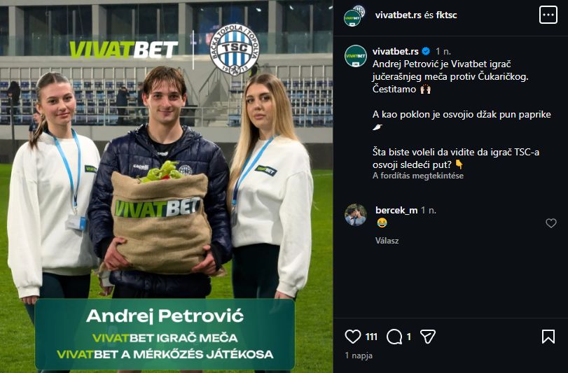 Szokatlan, de annál ízesebb jutalomban részesült Andrej Petrović, a szerb élvonalbeli Topolya játékosa, akit a Vivatbet a Čukarički elleni mérkőzés legjobbjának választott.