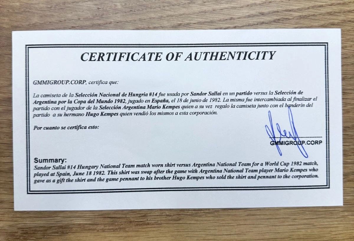 A hirdetésben a képek közé feltöltött eredetiségigazolás szerint Sallai a mérkőzés után mezt cserélt a legendás Mario Kempesszel, aki aztán ezt később elajándékozta testvérének, Hugónak, ő pedig eladta a mezt a futballrelikviákkal foglalkozó Gmmigroup.corp nevű cégnek, amely most eladná a világbajnoki dresszt.