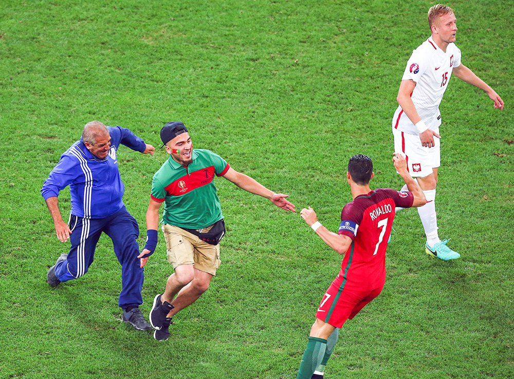 Egy beszaladó, vélhetően portugál drukker zavarta meg a mérkőzést az ibériai ország és a lengyelek Eb-negyeddöntőjének hosszabbításában. A szurkoló Cristiano Ronaldót próbálta volna megölelni(?), de a támadó eltáncolt előle, majd némi sprintet követően a biztonságiak leszerelték a férfit.