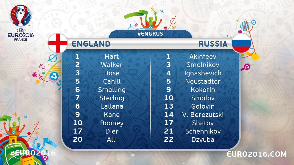 Az angoloknál a kispadon kezd majd Vardy, a középpályán pedig Rooney, a kezdőben közben öt Tottenham-játékos kap helyet (Danny Rose, Kyle Walker, Eric Dier, Dele Alli és Harry Kane), kérdés, hogy mire lesz így képes a brit gárda az Eb egyik sötét lovának tartott szbornaja ellen. A mérkőzést a neves olasz bíró, Nicola Rizzoli vezeti.
